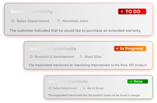 Define the opportunities you want to uncover — InsightSofa continuously analyzes every piece of feedback and the moment it detects a trigger, it automatically assigns it to the right person in your organization. No delays. No missed signals.